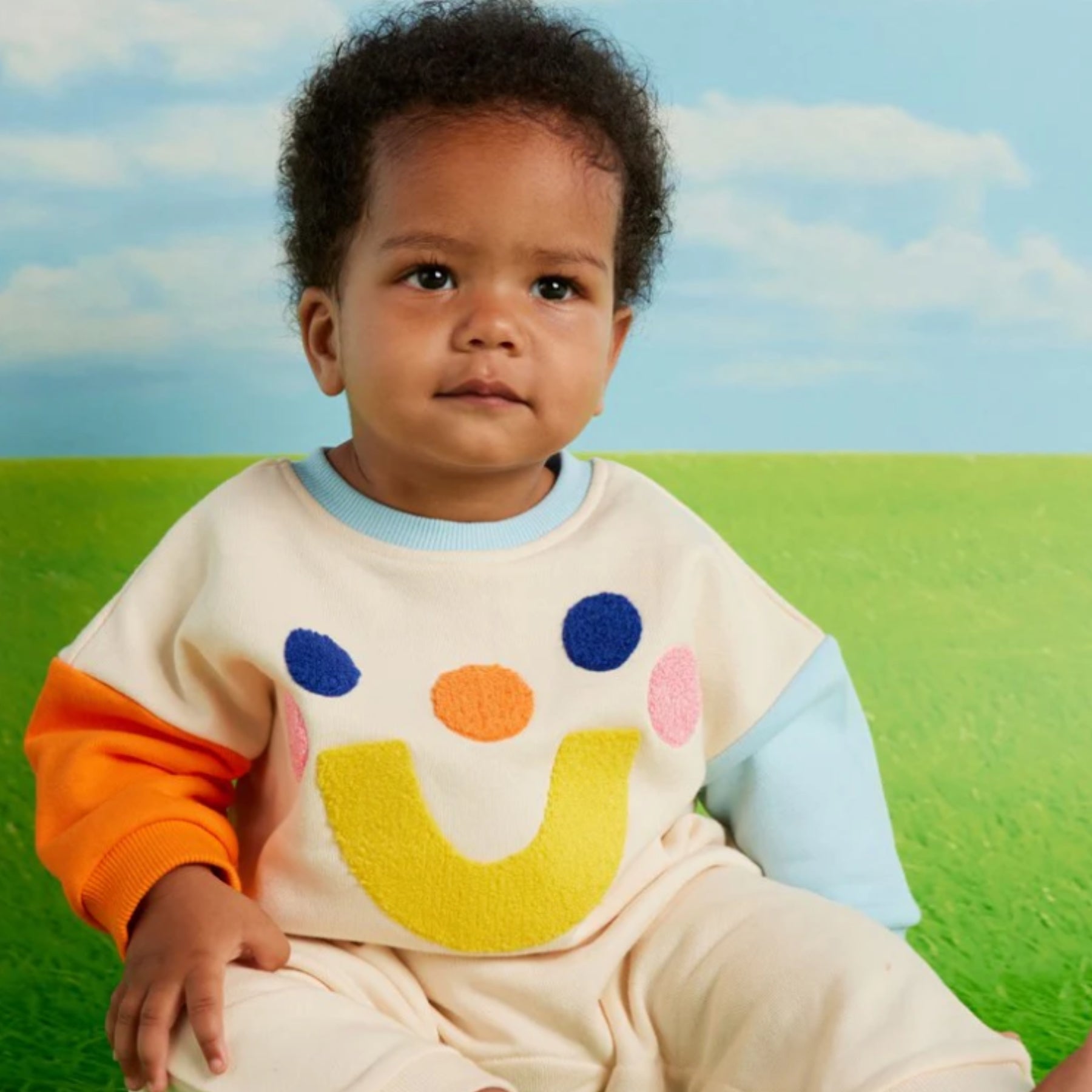 Happy jumpsuit from Halcyon Nights is here! Comfy and functional jumpsuit for babies featuring a super cute appliqué detail. Made in collaboration with artist Susie Hammer. Features an oversized shape and easy diaper change access.