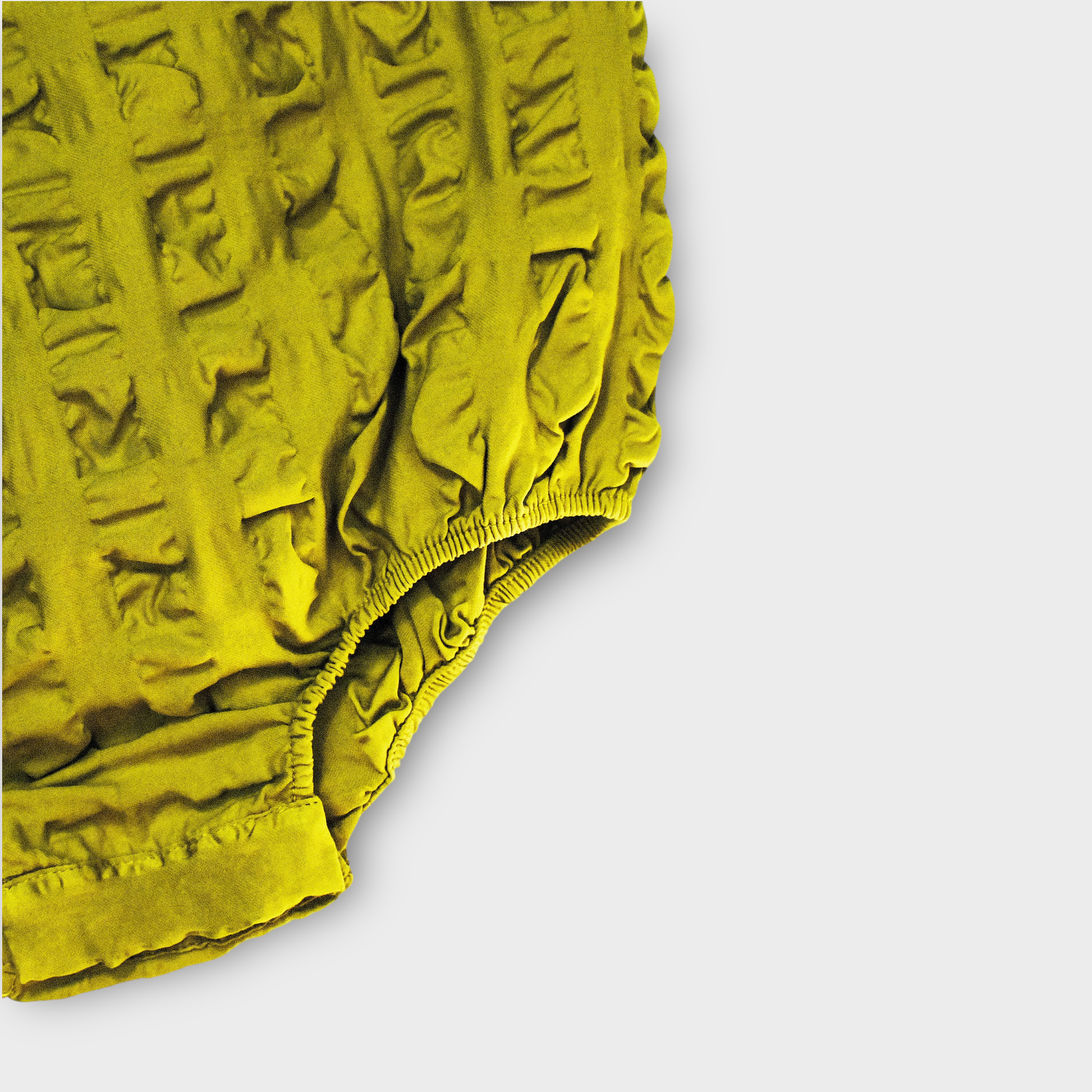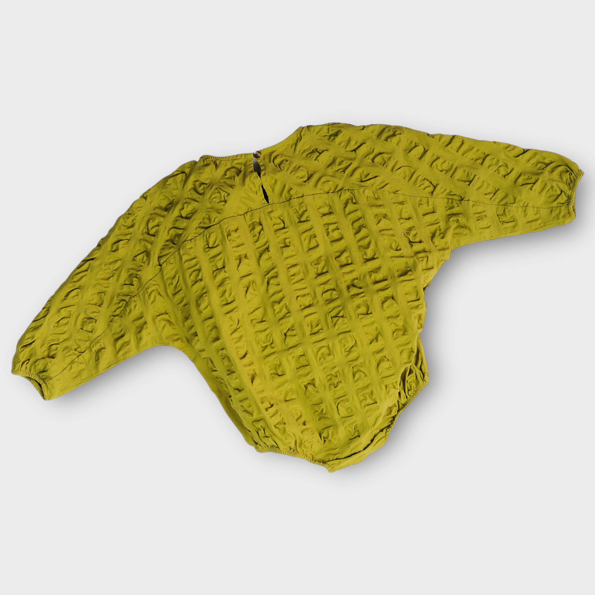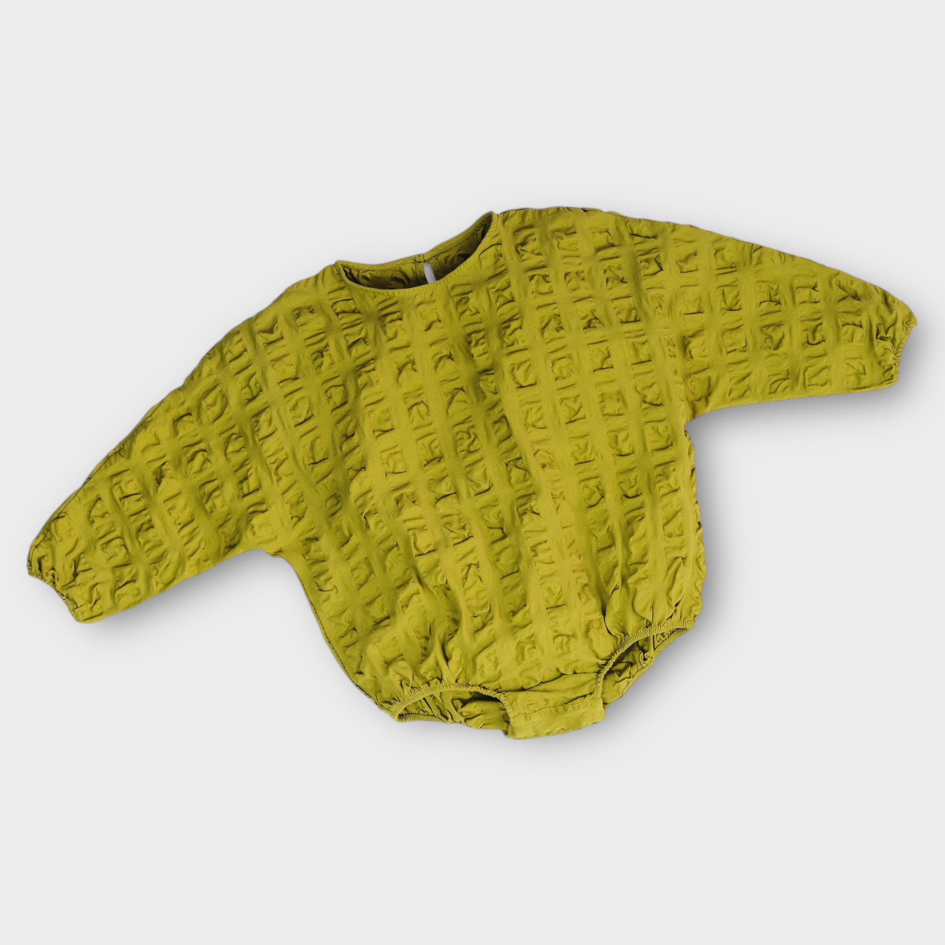 Woven, long-sleeve romper with elasticated leg opening and sleeve-hem. Curved seam-detail in back. Slit and button fastening at back neck, baby-popper opening at crotch. Voluminous silhouette for lots of comfort, wear on its own or with any of our trousers. Made from soft, washed cotton seersucker.