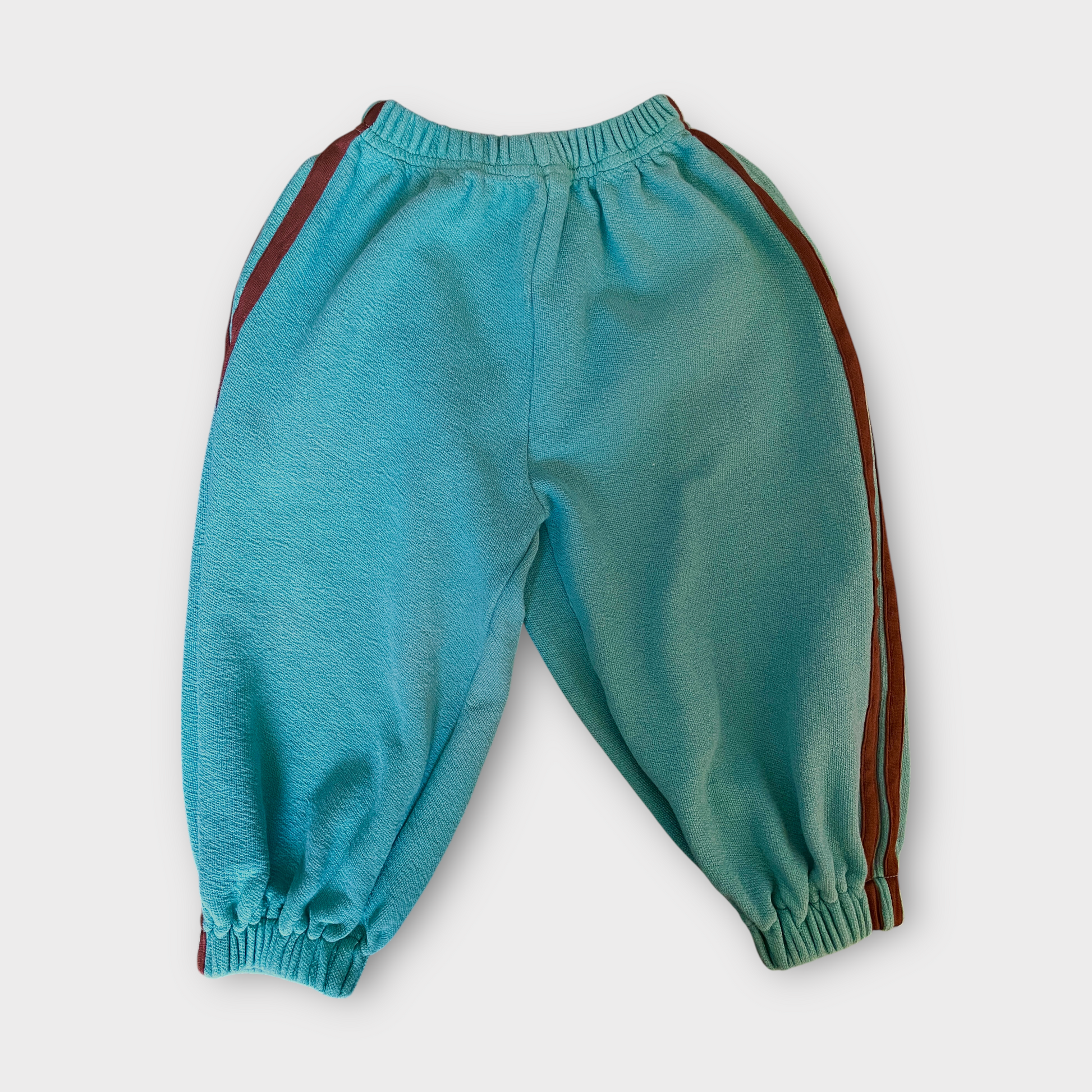 100% cotton with a light weave and two stripes on each side make these pants a fun twist on a classic. Elastic waist and cuffs for extra comfort. Pockets included:)